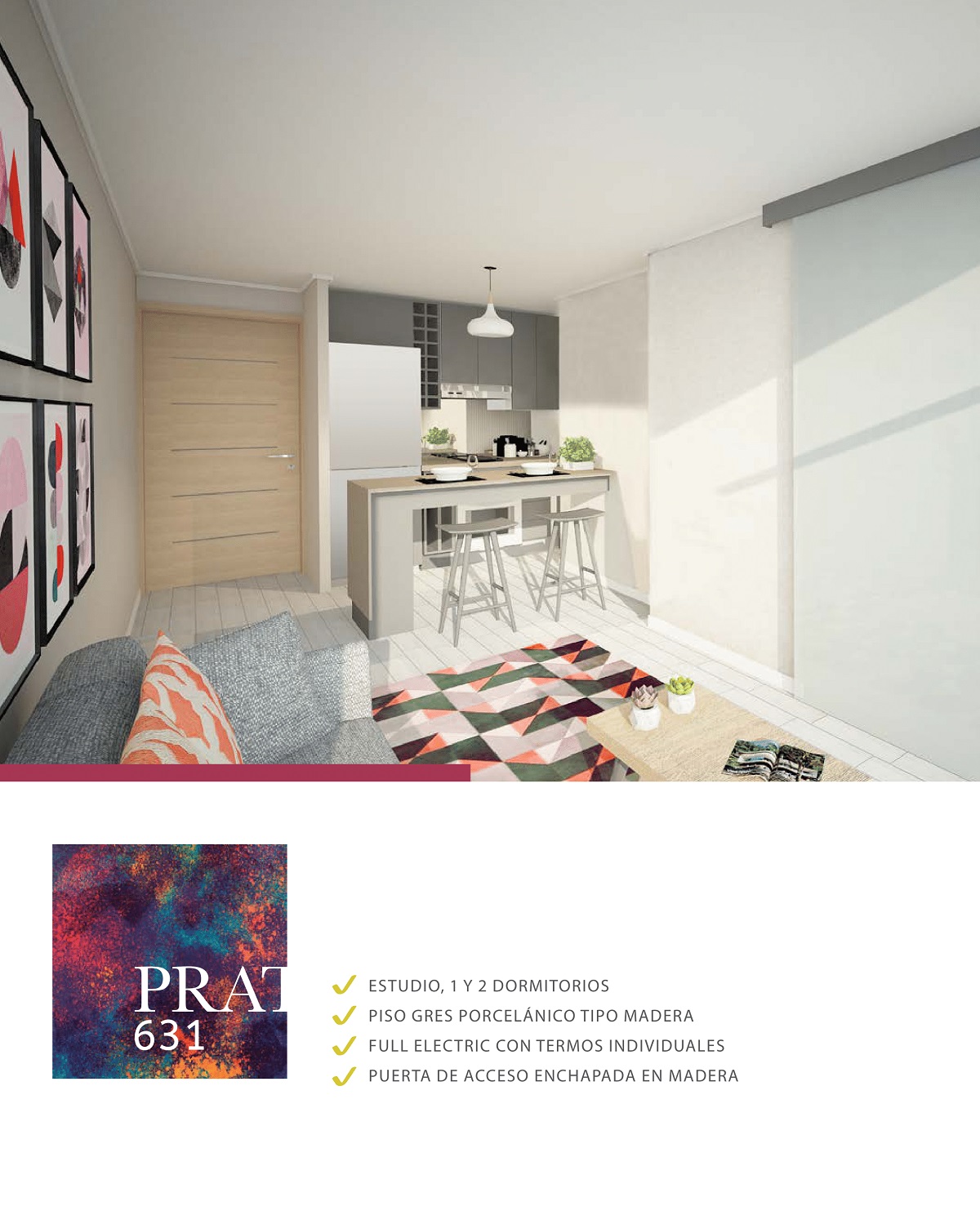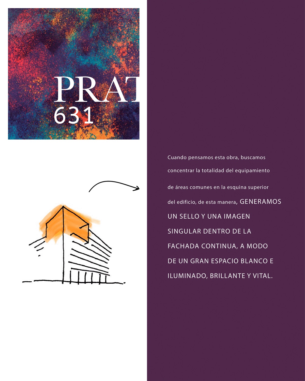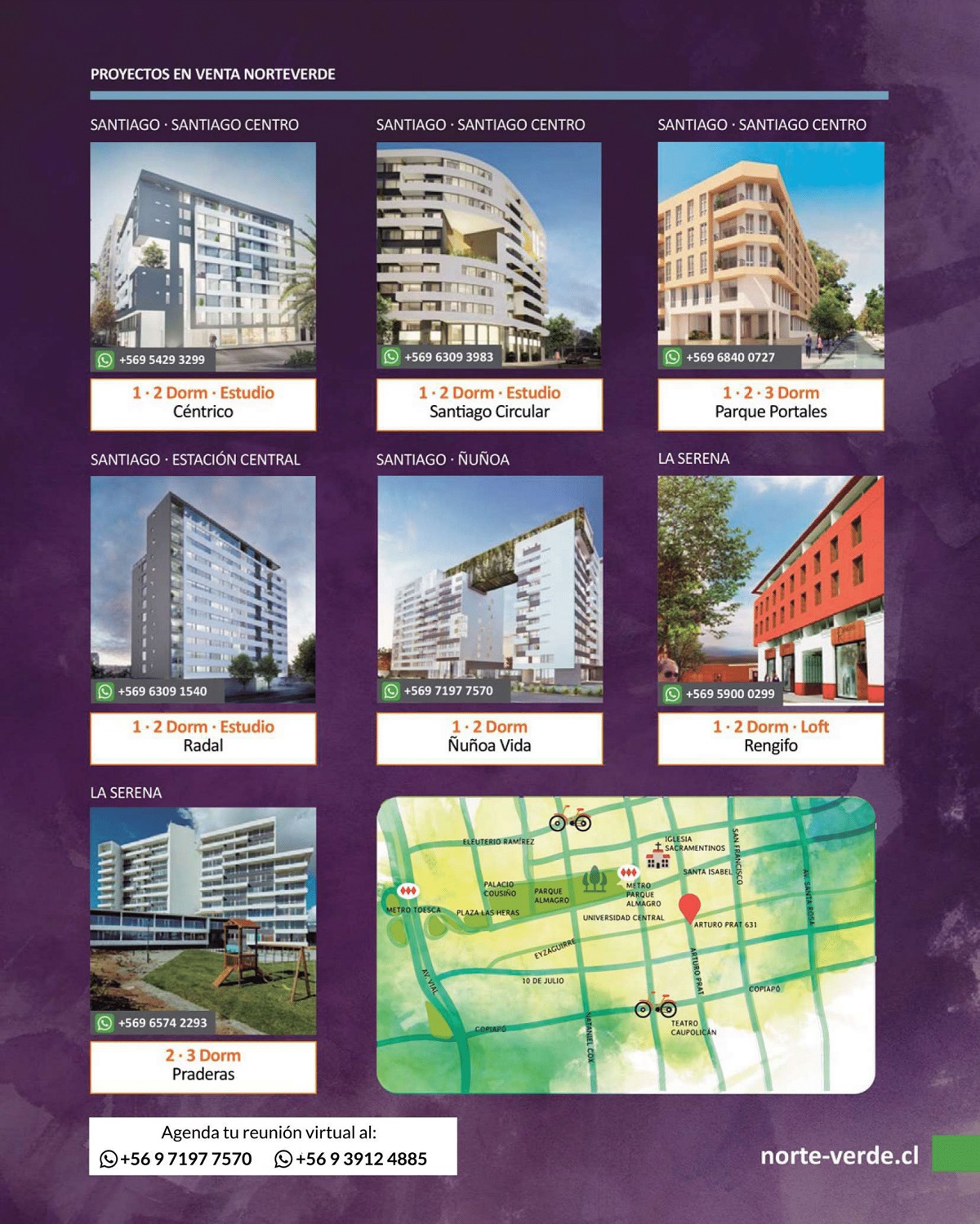 Ubicado en calle Arturo Prat 631, en Santiago Centro, se emplaza este nuevo proyecto de Norte verde. Este edificio cuenta con 9 pisos y ofrece una arquitectura de vanguardia en un barrio en pleno desarrollo inmobiliario, rodeado de áreas verdes. Cerca del Parque Almagro y a tres cuadras de la estación de metro Parque Almagro. En edificio Prat 631, se concentra un espacio blanco con iluminado equipamiento de áreas comunes modernas, que privilegian la comodidad y calidad de vida de sus residentes.